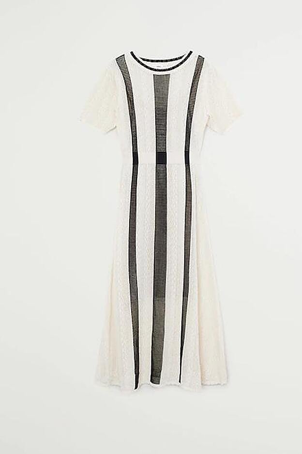 El primer flechazo es responsabilidad de este vestido bicolor, con cuello redondo, manga corta y cintura entallada. Con forro interior y tejido calado, es principalmente blanco, y tres rayas negras cruzan el frontal de la prenda desde el escote hasta el bajo.