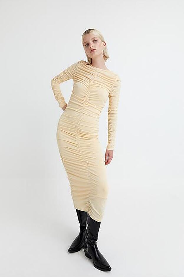 El primero de ellos ha aparecido entre los últimos lanzamientos de Sfera. En beige claro, o amarillo pastel, este vestido largo está drapeado tanto en el cuerpo como en las mangas.
