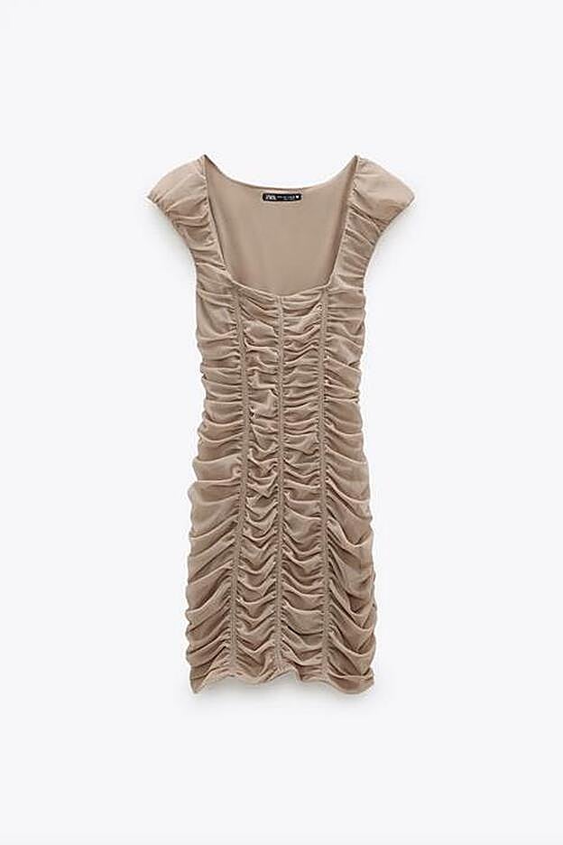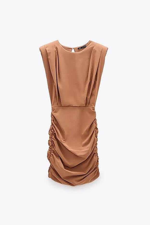 En Zara hemos encontrado dos diseños muy diferentes pero igual de apetecibles. Por un lado, en color camel claro, está este vestido corto con cuello redondo y manga sisa con hombreras.