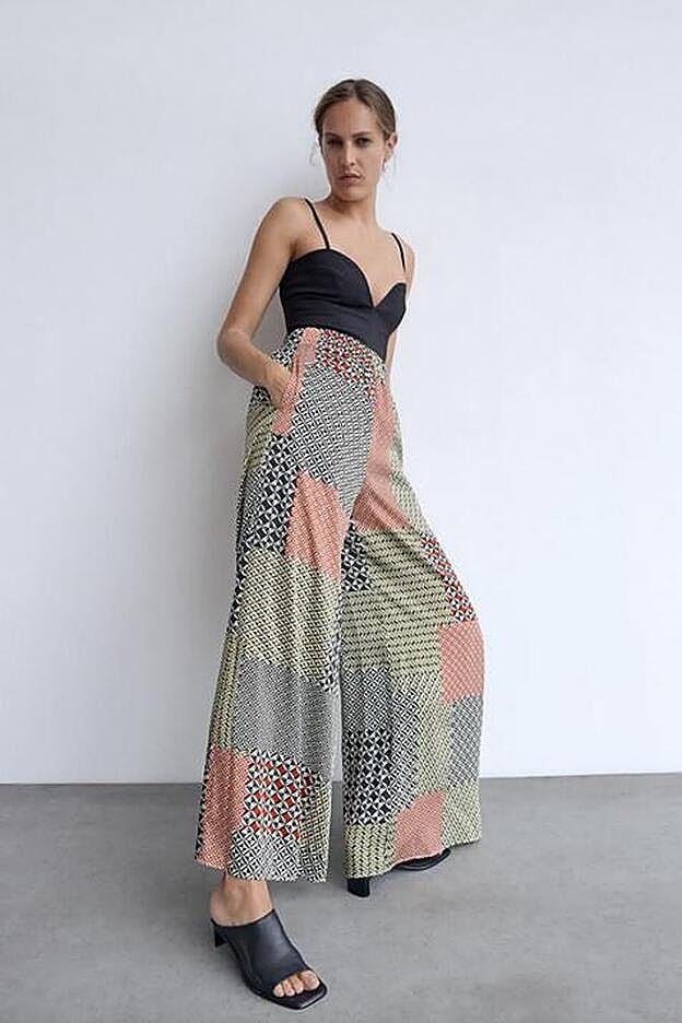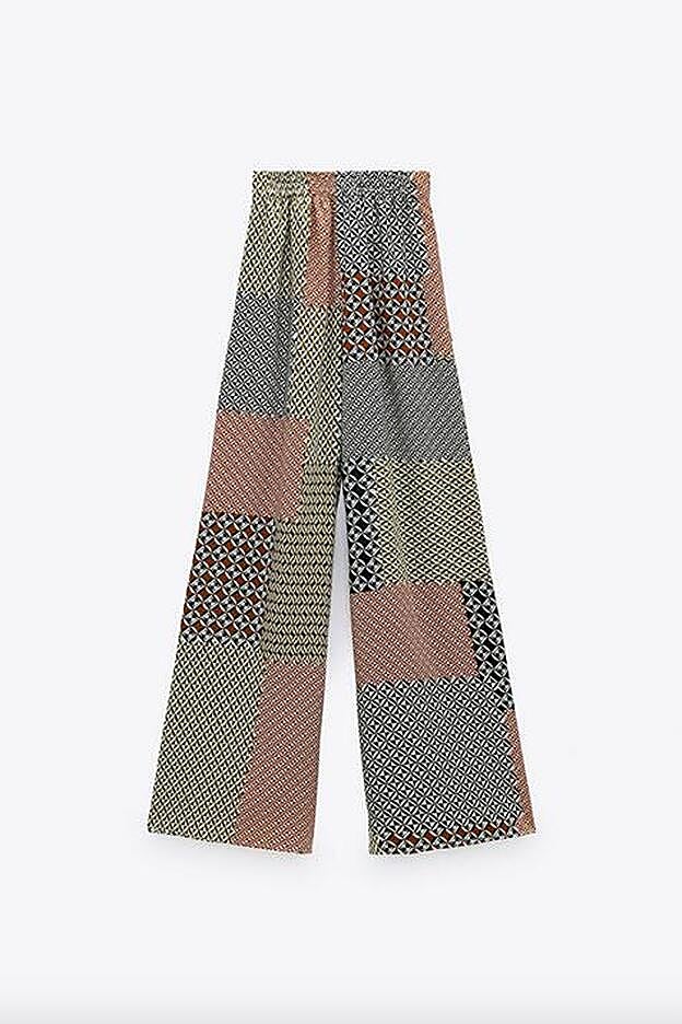 Por ultimo, Zara también ha lanzado en diseño patchwork este pantalón fluido de tiro alto con pernera ancha y cintura elástica.