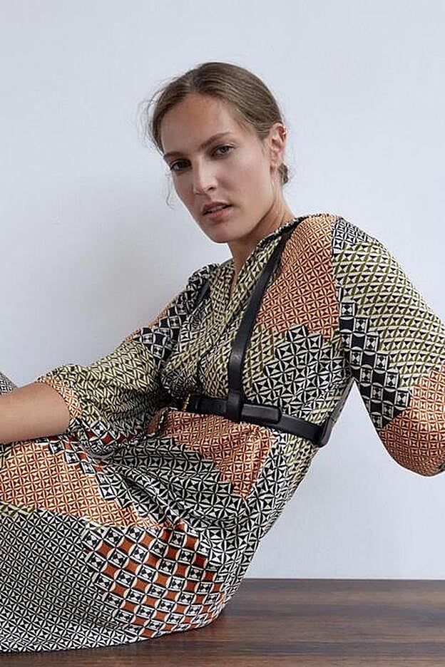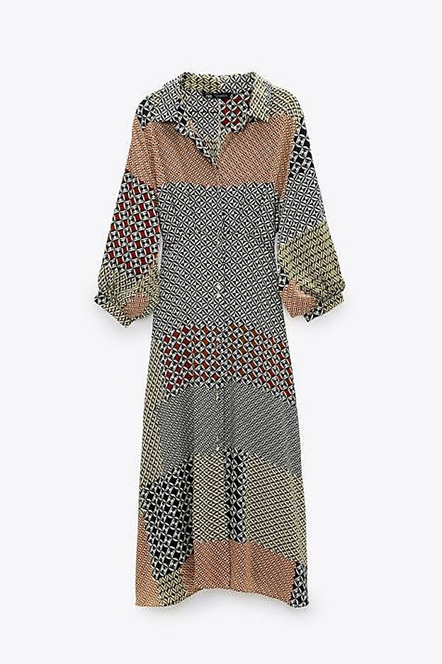 La primera propuesta de la firma de Inditex es este vestido midi con cuello solapa, escote de pico y manga larga. Con el diseño patchwork en tonos naranjas, verdes y negros, el bajo del vestido acaba en evasé.