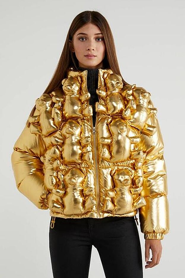 Muchas cosas llaman la atención en este diseño, la primera de ellas es inequívocamente el acabado metalizado que tiene. Está confeccionado en un potente tejido brillante dorado. Pero la cosa no queda ahí porque si nos fijamos un poco más podemos descubrir que el efecto acolchado se consigue como resultado de la aplicación de pequeños osos de peluche distribuidos por toda la parte frontal.