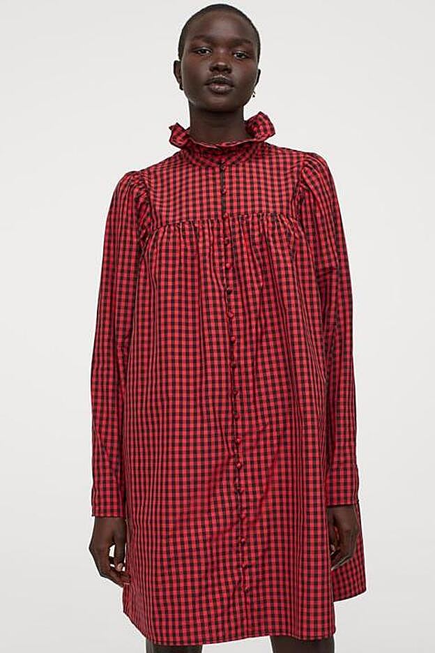 Por último, con un diseño que apuesta por uno de los estampados tendencia de la temporada, este vestido rojo de cuadro negros, con cuello alto de volantes y mangas abullonadas acabadas en puño con botón.