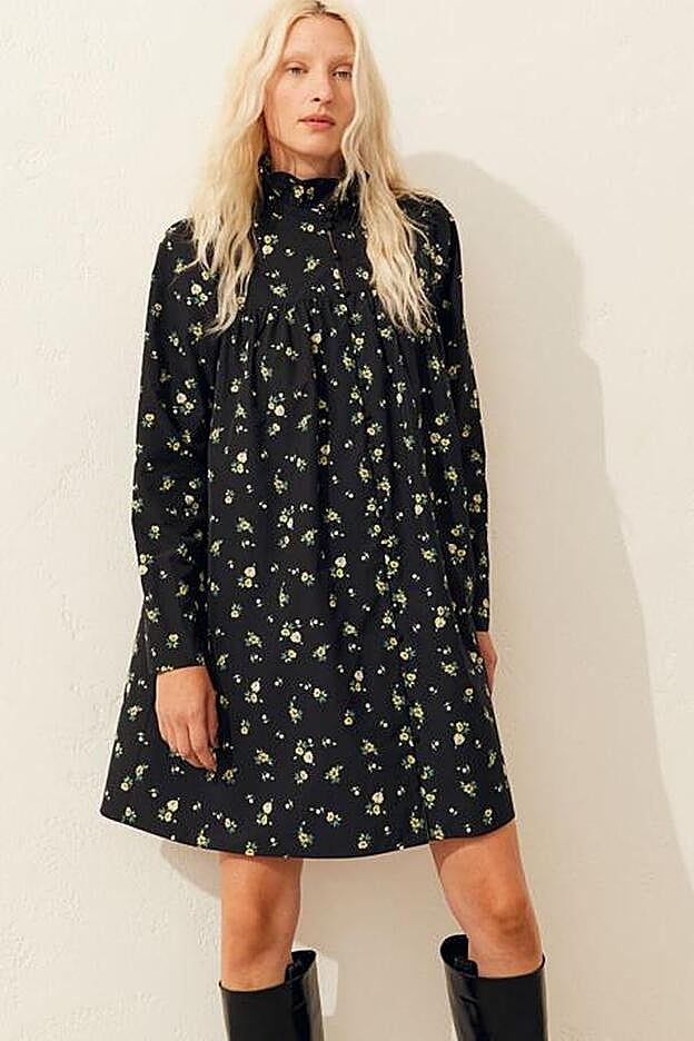 Apostando igualmente por el negro pero añadiéndole un estampado floral amarillo, el segundo vestido que nos ha conquistado es este con un diseño recto similar en el que encontramos cuello alto de volantes y cierre frontal de botones revestidos.