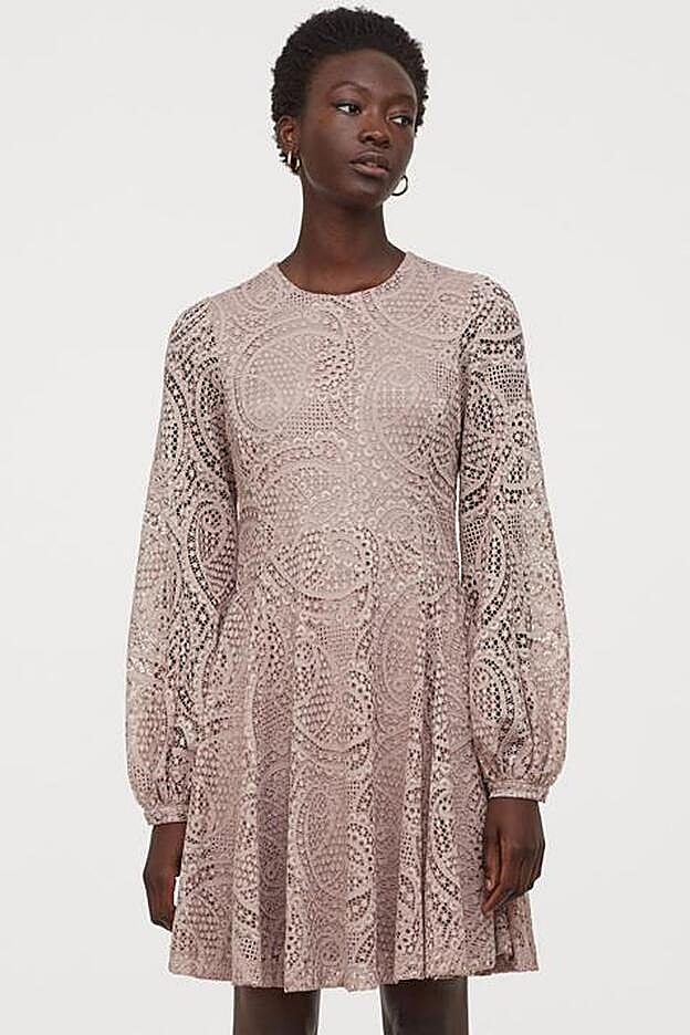 Si lo que buscas es una alternativa más bohemia con la que mantener intacta la elegancia, este es el vestido indicado. Corto, con encaje en tono rosa pálido, cremallera oculta en la espalda y mangas largas ligeramente amplias con elástico fino revestido en los puños. Con cuerpo entallado, costura en la cintura y falda circular amplia. Cuesta 59,99 euros.