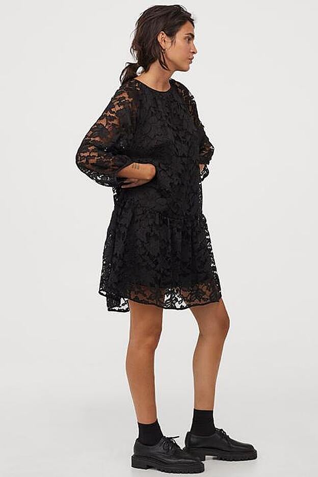 Romántico pero con un ligero aire grunge. El vestido negro que reformula las bases del clásico LBD. Con patrón evasé y falta corta de encaje con cuello redondo fruncido y cierre de lágrima con botón en la nuca. Mangas globo raglán tres cuartos con ribete fino y costura fruncida en la falda para un toque extra de volumen. Cuesta 34,99 euros.