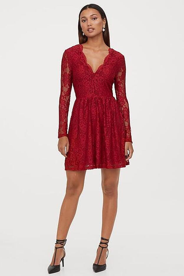 Como no podía ser de otra manera, el rojo, color de la buena suerte, se abre paso con este diseño de manga larga y escote de pico, ajustado de cuerpo y con falda evasé. Una opción perfecta para lucir con un par de sandalias de tiras y joyas como pendientes grandes o un collar importante. Cuesta 39,99 euros.