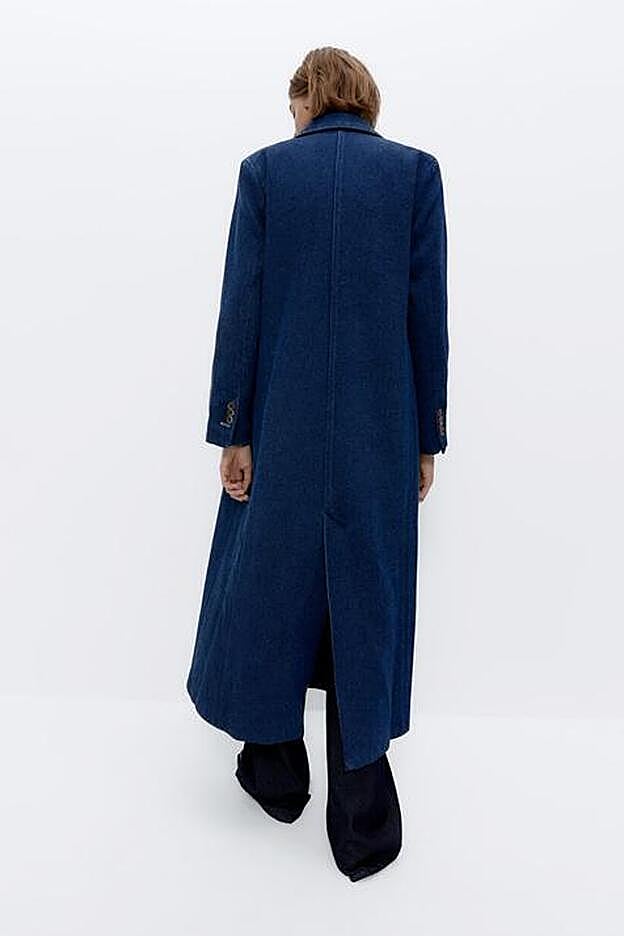 El azul índigo más típico del denim y su acabado le confieren un aspecto desenfadado, con unas amplias solapas y un cierre de tres botones sencillo. Sin embargo el largo XL y la forma recta juegan un papel complementario para darle enjundia y presencia como si fuera un gabán de paño.