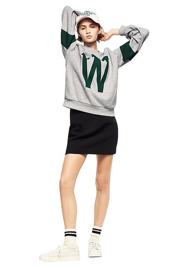 La prenda fundamental en torno a la que gira toda esta propuesta es, como no podía ser de otra forma, la sudadera con iniciales impresas en tamaño XL. Una reminiscencia de los jerseys deportivos de equipos de beisbol, acompañana por una gorra de visera y combinada con una minifalda para contrarrestrar el efecto, haciendo que lucirlas con un par de zapatillas blancas sea un ejemplo de estilismo casual perfecto.