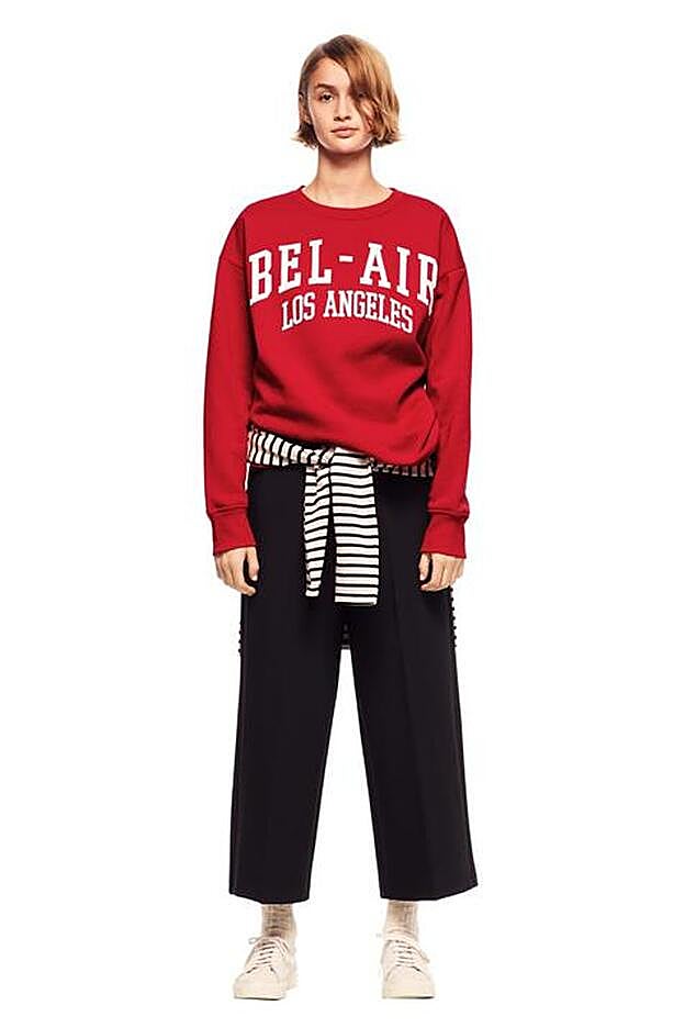 Declinada en rojo y con grandes letras impresas, esta sudadera es el recurso perfecto para mezclar con un par de pantalones negros rectos y una sudadera de rayas anudada a la cintura. Pero para hacerla apta para las aulas, se puede conjuntar con una americana de cuadros príncipe de Gales, una camisa oxford lisa en tonos claros y un par de vaqueros rectos de bajo deshilachados
