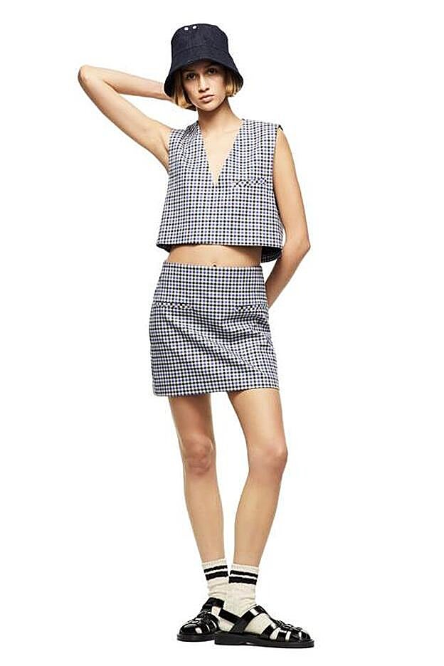 Coordinar estampados, como este de cuadros tampoco podía quedar fuera de los referentes sesenteros. Y hacerlo en un conjunto de dos prendas funciona gracias a un cuerpo corto de escote pico y manga sisa con falso bolsillo de vivo en pecho (19,95 €) y una falda mini de tiro alto conalsos bolsillos de vivo en delantero y cierre lateral con cremallera oculta en costura (19,95 €).
