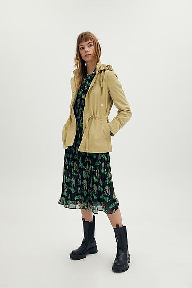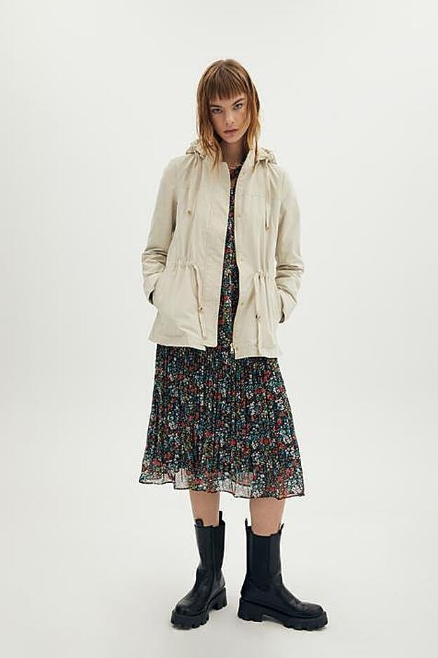 El largo medio de la parka hace que sea perfecta para combinarla con un vestido de flores de corte midi. Cuesta 39,99 euros y está disponible en tallas de la S a la XL.