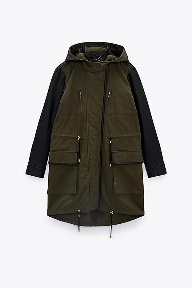 En la misma línea, Zara también nos ha tentado con una parka de cuello subido y capucha desmontable, pero en este caso el contraste de tejidos es lo más destacable, ya que las mangas son de efecto piel negra mientras que el resto de la prenda es de lona verde encerada.