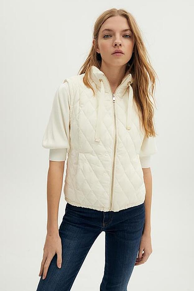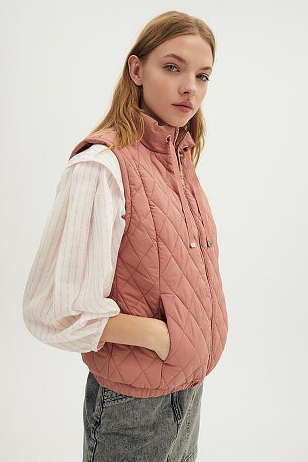 Con acolchado en diseño de rombos, el chaleco está disponible en rosa y en blanco, con cuello chimenea con cordones a tono, cierre de cremallera metalizada y bolsillos laterales al bies.