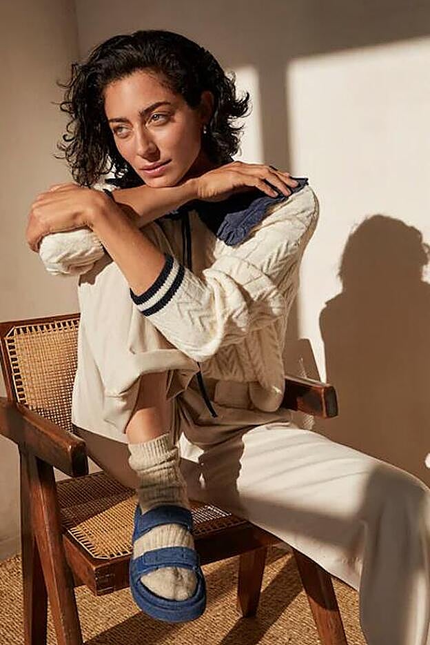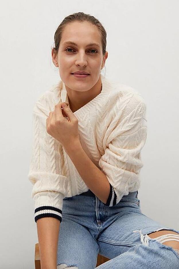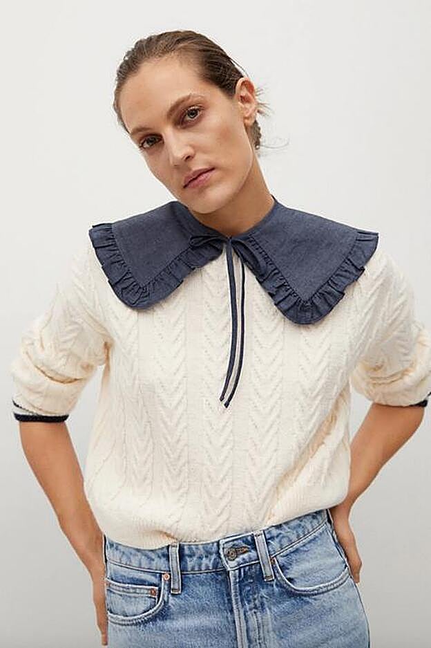 Con costura de hombro caída y puños a contraste en color azul, a juego con el babydoll, el jersey tiene un precio de 39,99 euros y está disponible entre las tallas XS y XL.