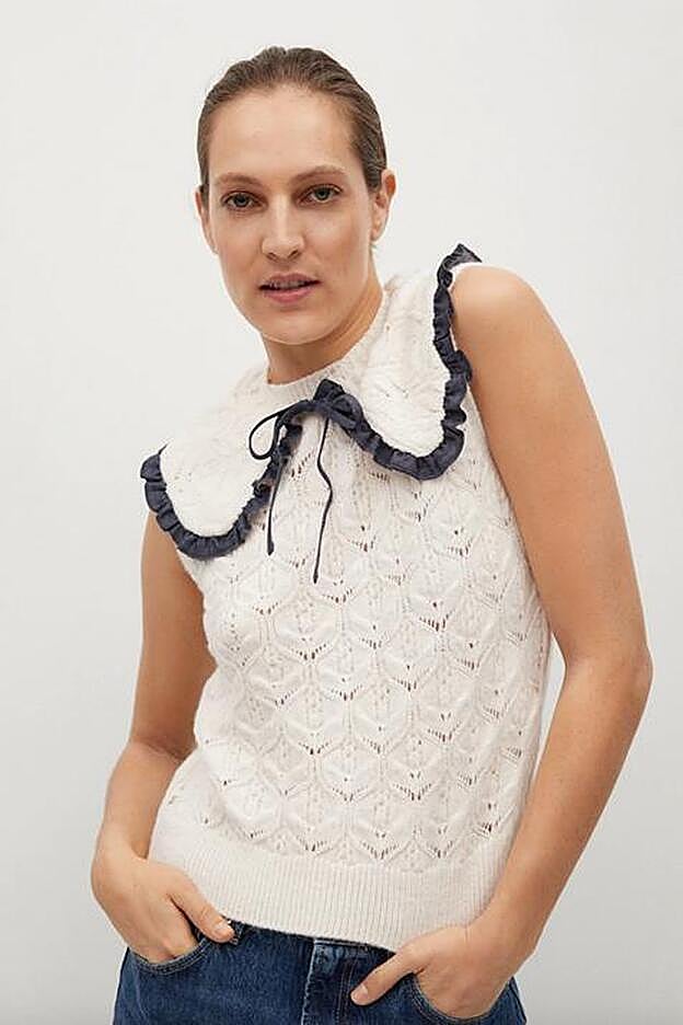Las agraciadas con este detalle que hace de nuestras prendas una creación ideal para nuestros looks más románticos han sido un jersey y un chaleco, ambos en color crudo. Dos propuestas llenas de estilo a las que podemos sacar mucho partido combinándolas con nuestra falda favorita o nuestro pantalón fetiche. Y como el cuello babydoll es extraíble en realidad contamos con dos prendas en una.