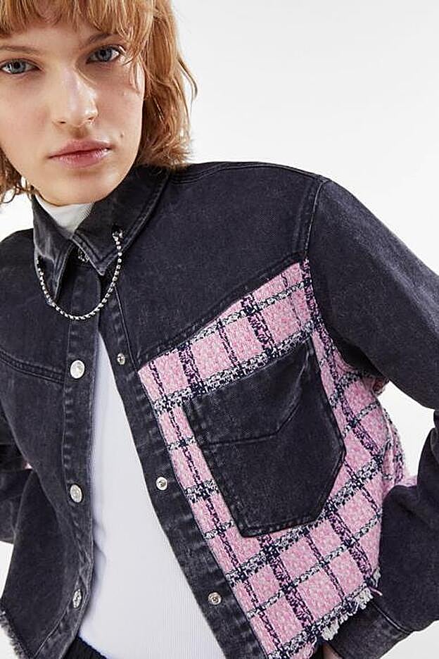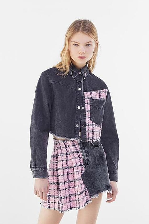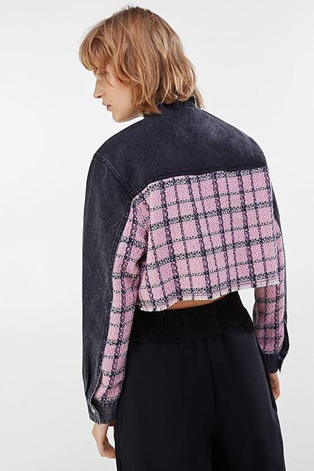La otra propuesta combina tejidos denim en negro con tejidos con estampado de cuadros en rosa chicle y negro también. Con cuello de camisa y cierre de botones de clip frontal, el bajo acaba en deshilachado.