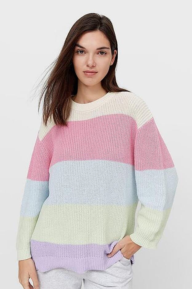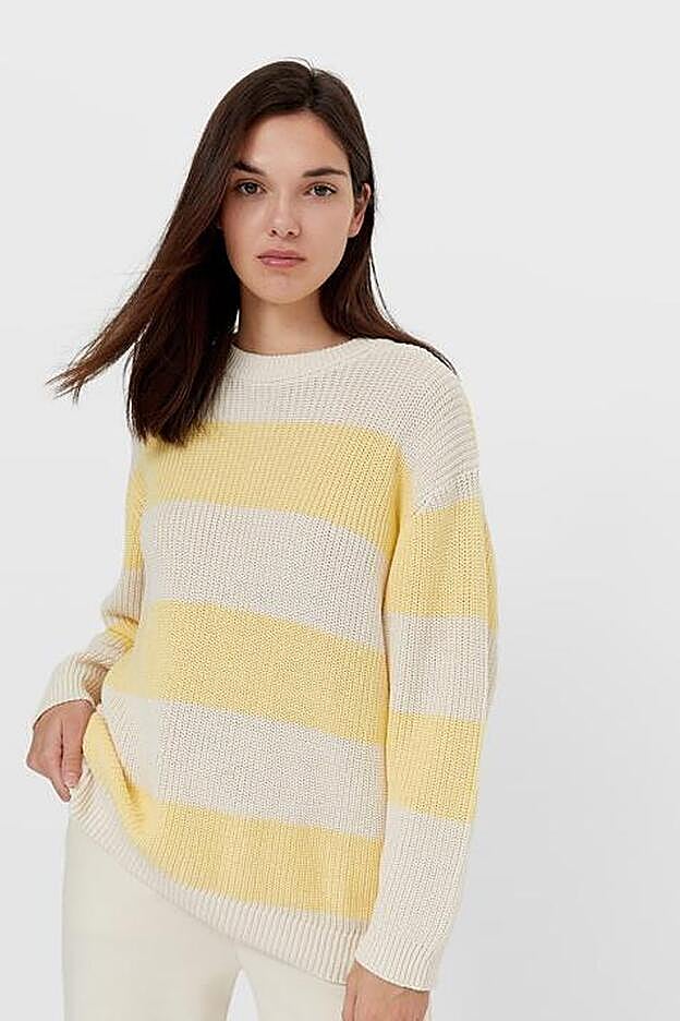Por último, para todas aquellas que apuesten por un look de tonos claros o se sumen a la imparable tendencia del amarillo pastel está este de diseño oversize, con cuello redondo acanalado y mangas largas que gracias al estampado de rayas lo combina con el color crudo. Podemos encontrarlo entre las tallas XS y L por 19,99 euros.