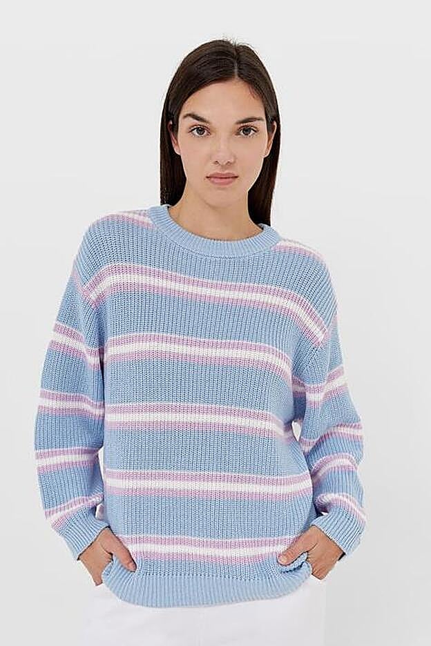 Con el mismo diseño oversize y con el azul como protagonista, este jersey de punto con rayas lilas y blancas de mangas largas y acabados acanalados en puños, bajo y cuello tiene un precio de 19,99 euros y está disponible entre las tallas XS y XL.