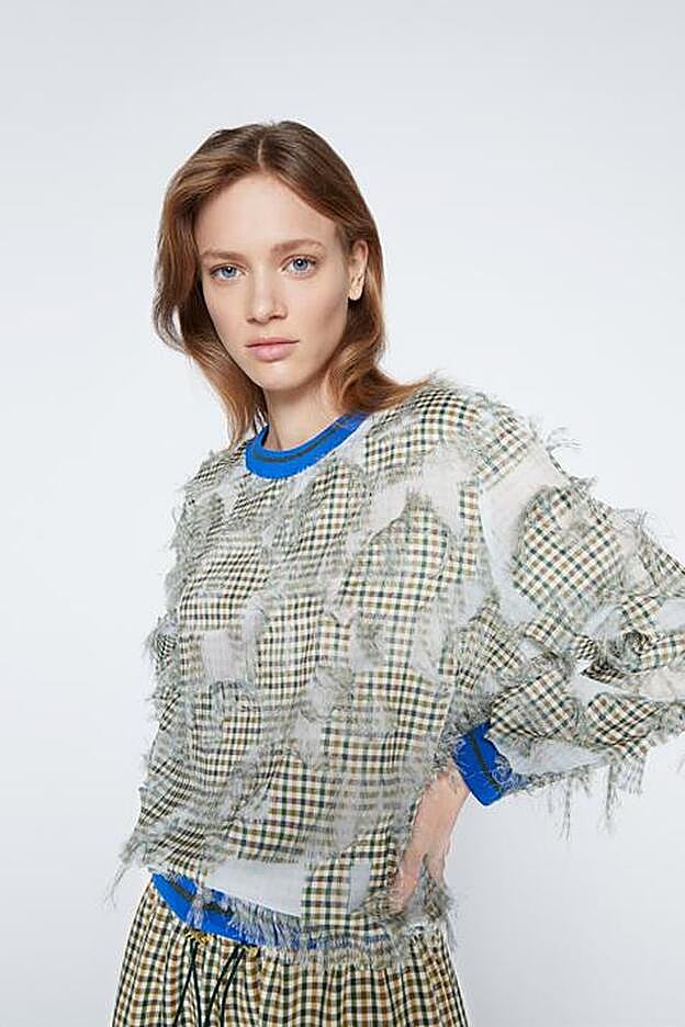 La sudadera apuesta por un diseño deshilachado y viene con cuello redondo y mangas largas. Para aumentar su vistosidad, los acabados en rib del bajo, los puños y el cuello vienen a contraste en azul intenso. Podemos encontrarla en las tallas S y M por 69 euros.