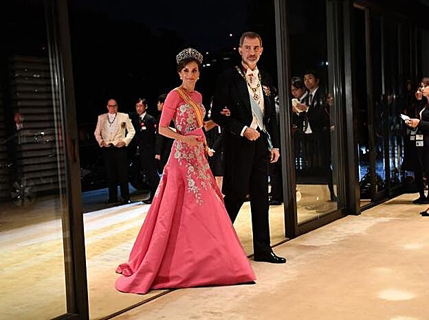 Para este acto solemne en Tokio, doña Letizia se vistió de reina con un imponente vestido rosa capote con bordado joya floral de inspiración mantón de Manila que le sentaba como un guante, y que aunque bien podría llevar la firma de Duyos o de Caprile, es un diseño exclusivo y a medida de Carolina Herrera (que también sellaba el nuevo clutch a juego).