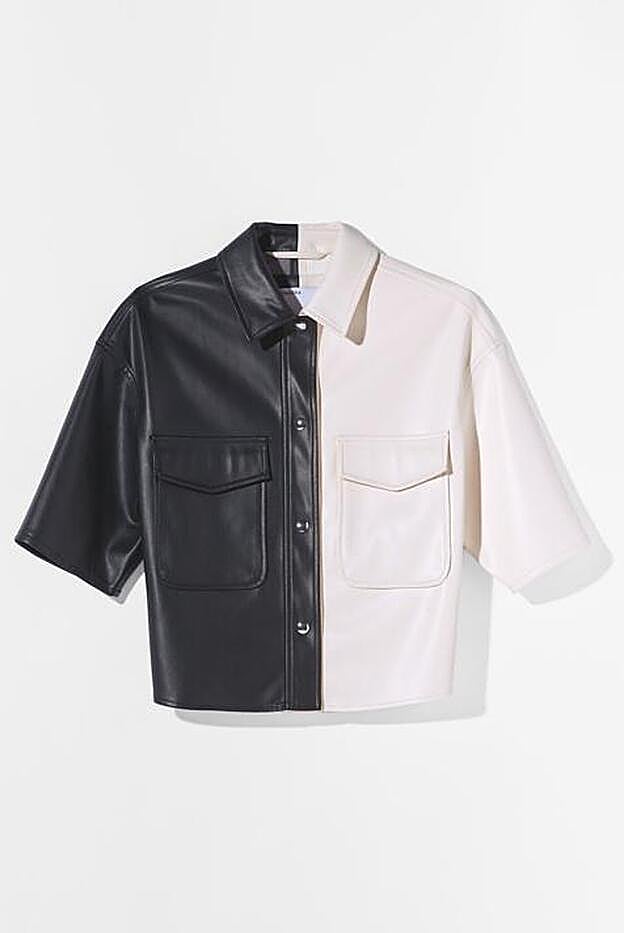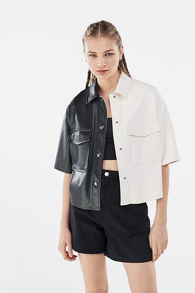 La primera de ellas es una sobrecamisa corta de efecto piel con bolsillos frontales dividida en vertical con un lado en blanco y otro negro que puede llevarse abierta sobre un top tipo bandeau o simplemente cerrada.