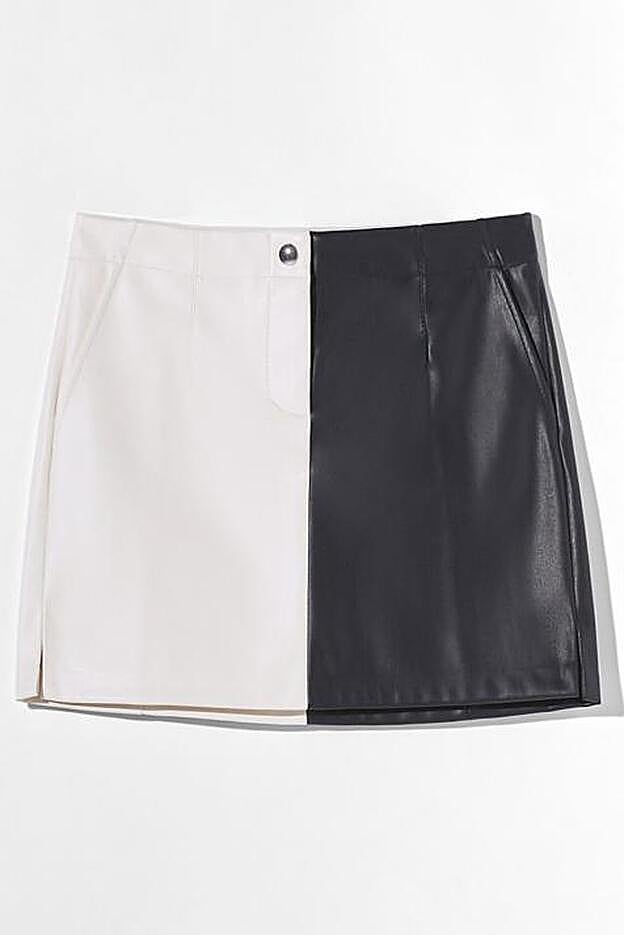 Para completar el conjunto, la nueva colección de Bershka incluye una minifalda también en efecto piel que sigue el mismo patrón bicolor. Tiene una pequeña apertura lateral y el contraste cromático permite llevarla con un top ajustado negro o una camisa cropped, con una marcada inspiración noventera.