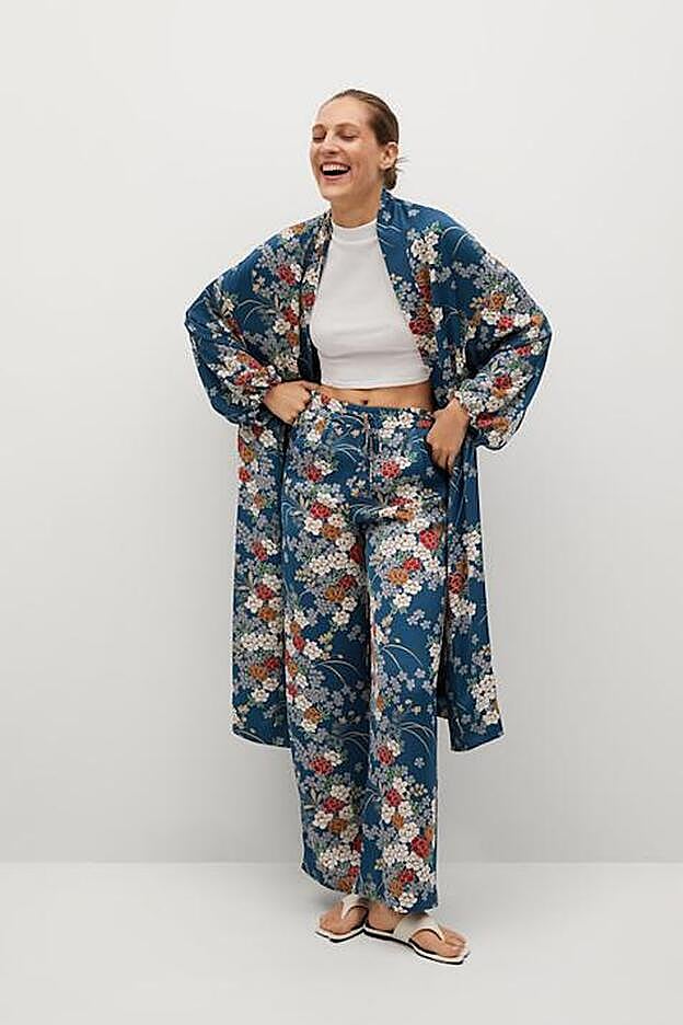 Por si esto no fuera suficiente, el conjunto se completa con un par de pantalones en el mismo tejido y con el estampado a juego. Ideal para usarlo como pijama y también como traje de chaqueta de cara a los días de primavera.
