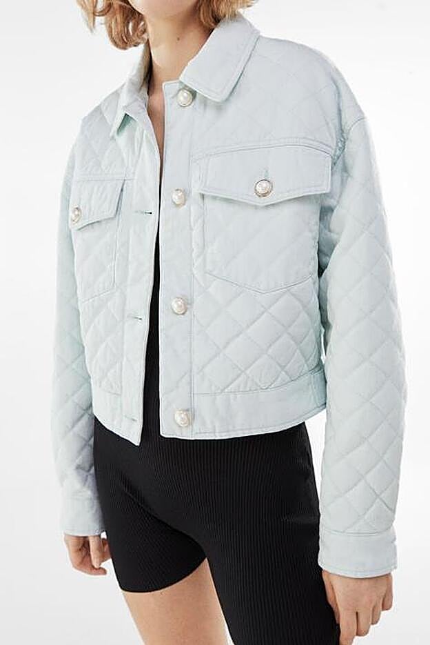 En Bershka han lanzado una cazadora de algodón de diseño cropped acolchado en dos colores diferentes, verde agua y negro.