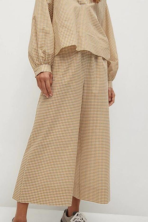 El pantalón es de diseño culotte, con bajos acabados por encima del tobillo y cintura elástica. Con bolsillos laterales, forro interior y tiro alto, también tiene estampado de cuadro Vichy en mostaza y crudo, y cuesta 29,99 euros. En la página web se ha agotado en todas las tallas y tendrás que apuntarte en la lista de espera o buscarlo en las tiendas.