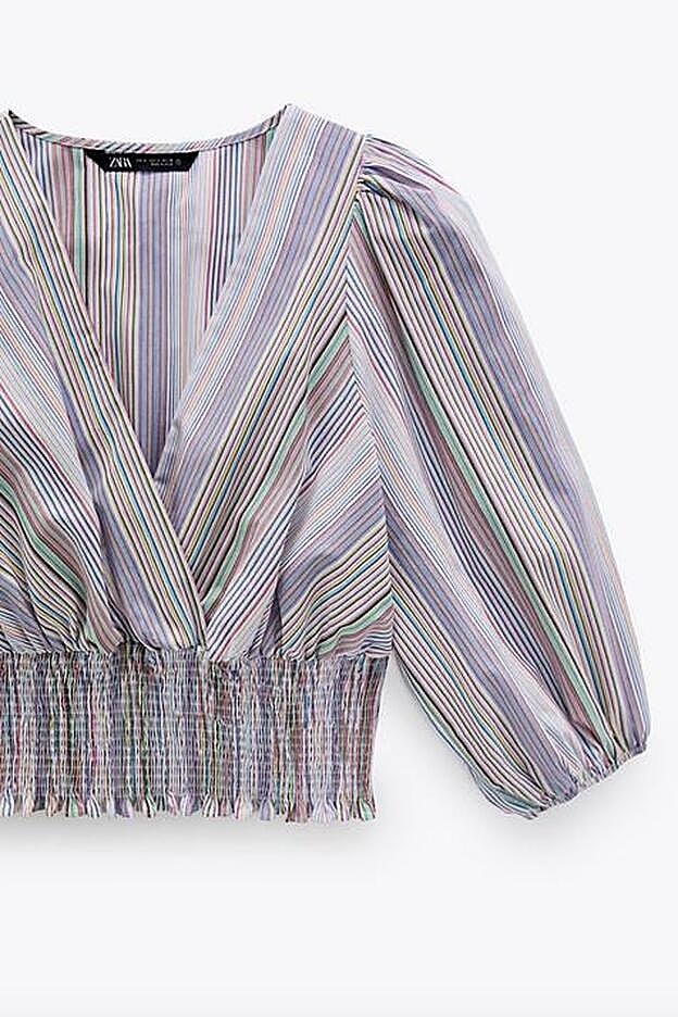 Su estampado rayado multicolor incluye tonos como el lila, el azul, el amarillo, el verde o incluso el negro. Y su diseño nos propone un precioso escote de pico cruzado y mangas abullonadas por debajo del codo.