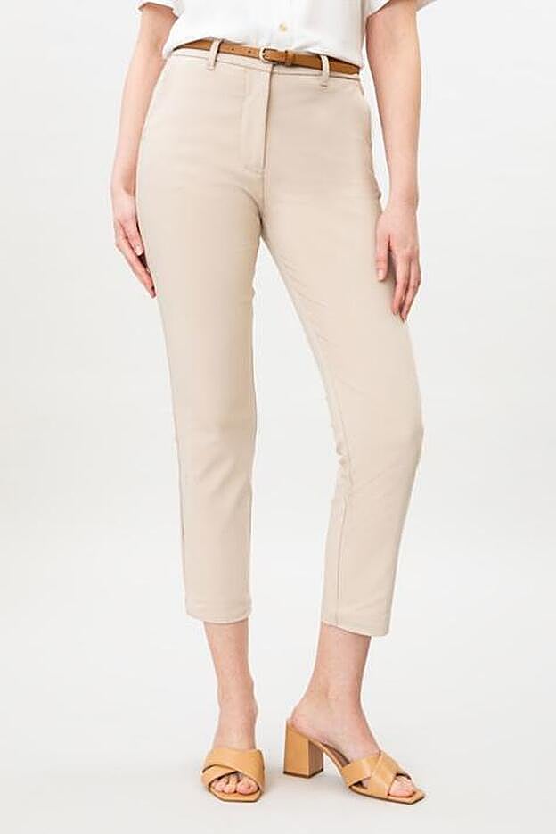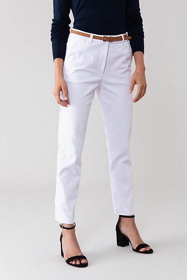 Si apostamos por el diseño liso podemos elegir entre el negro, el blanco, el crudo y el azul marino para este pantalón de corte chicno que viene con cinturón en efecto piel con hebilla metálica y aberturas laterales en los bajos.