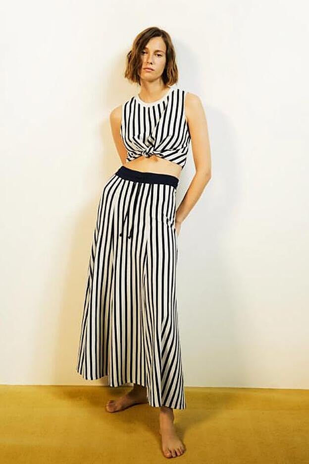 Empezamos con el conjunto de rayas finas negras sobre fondo blanco que consta de falda larga y cropped top con nudo. La falda es de tiro alto, cintura elástica y bajo evasé y cuesta 25,95 euros. Por su parte, el top es corto, de manga sisa y con detalle de nudo en la delantera y cuesta 9,95 euros. Así de ideal queda esta combinación:
