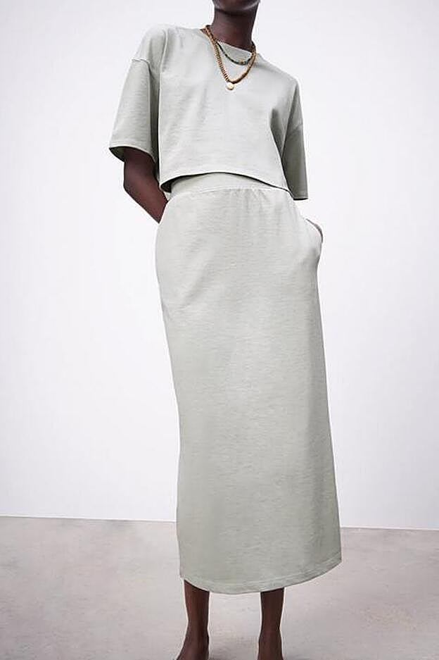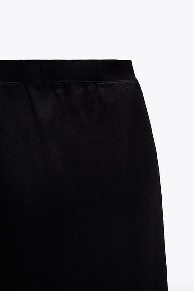 De tiro alto y diseño midi, esta falda de Zara viene con cintura elástica y bolsillos laterales ocultos en costura.
