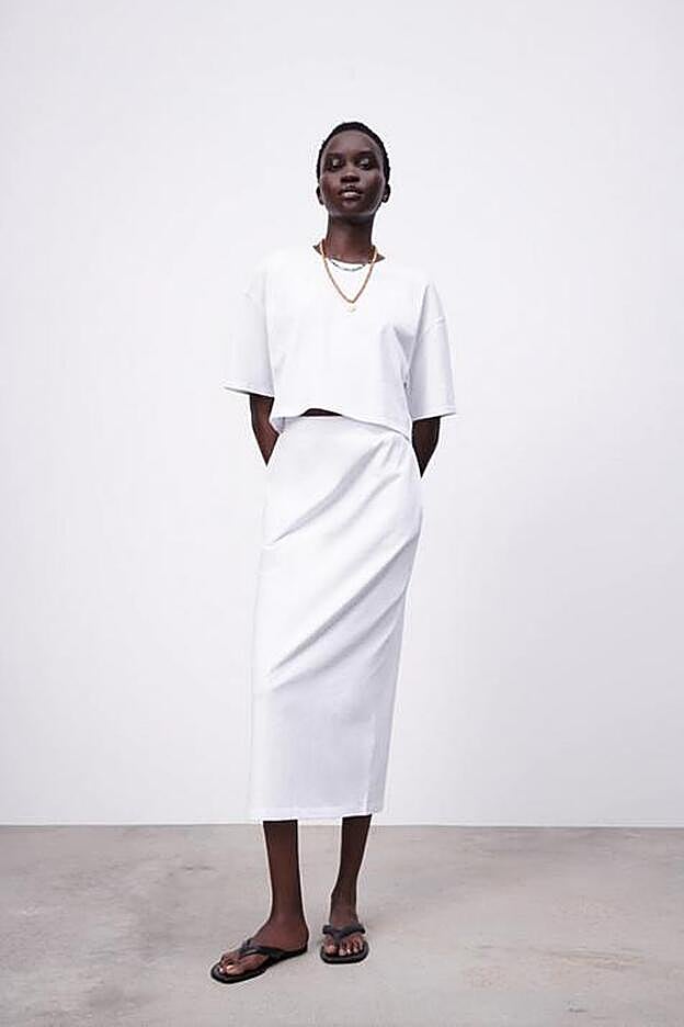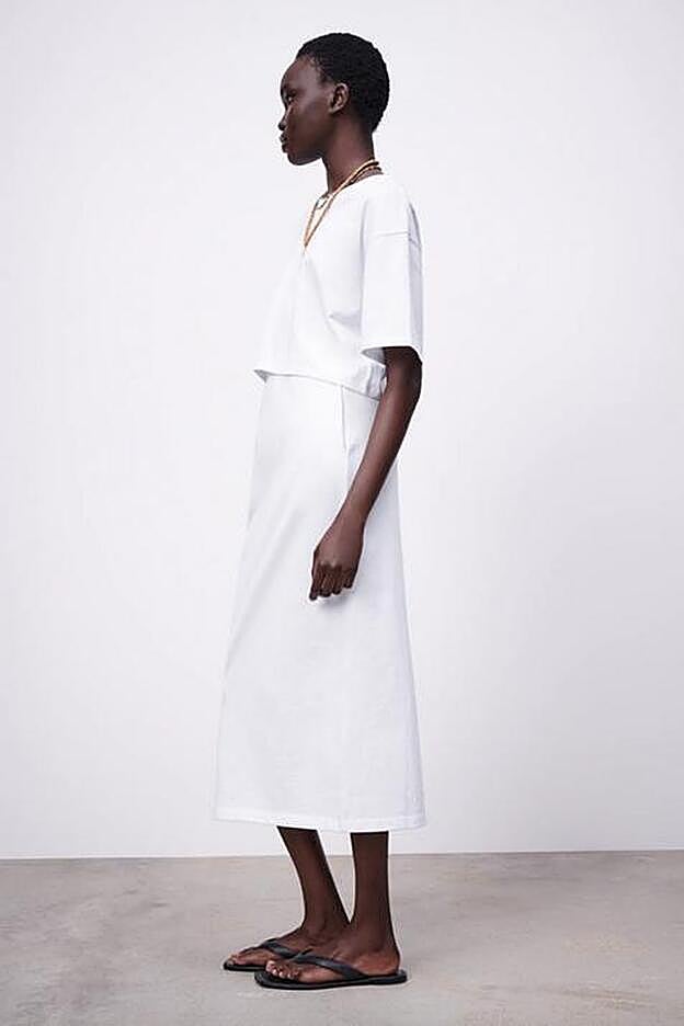 La firma responsable del hallazgo es Zara, que ha incluido en su última colección una falda midi de tiro alto en colores tan combinables como el negro o el blanco y tan primaverales como el verde claro. Tres propuestas perfectas para unirlas a nuestro top o camiseta favorito, calzarnos unas sandalias o unas bailarinas y triunfar por muy poco dinero.