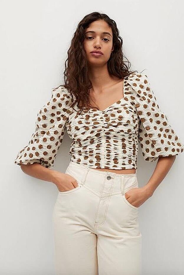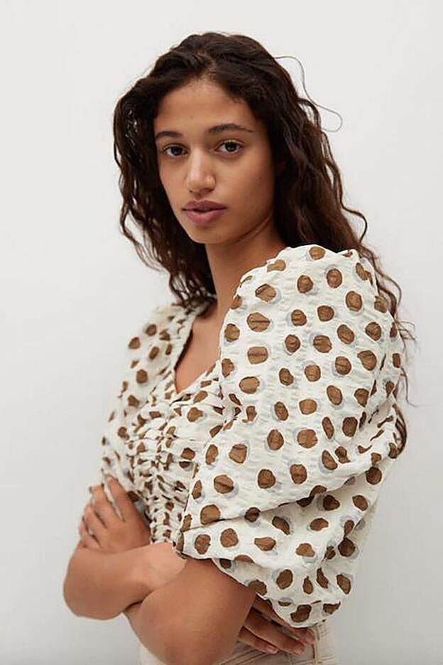 Confeccionada al 100% en algodón, la blusa de lunares de Mango tiene el cuerpo fruncido y el escote recto, con mangas abullonadas que pueden llevarse caídas, dejando los hombros al aire.