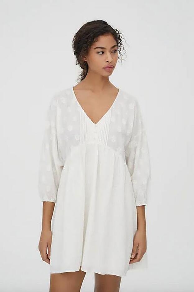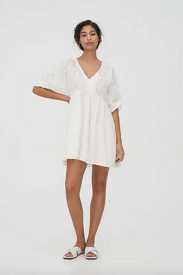 De venta exclusiva en la web de la firma, este vestido mini blanco con escote de pico, botones frontales y manga francesa viene con silueta fluida.