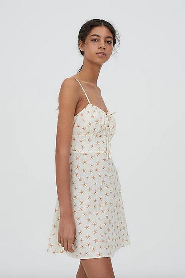 Uno de nuestros favoritos es este vestido mini de estrellas en color naranja sobre fondo blanco. Con tirantes finos y detalle de frunces en el pecho, tiene la silueta ajustada y la falda con ligero vuelo.