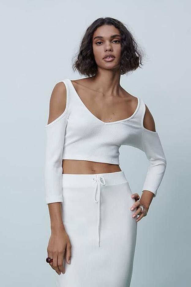 Este es el primer modelo que puedes encontrar en Zara, un jersey de punto de canalé blanco con escote de pico y manga larga. Está disponible en tallas de la S a la L por 12,95 euros.