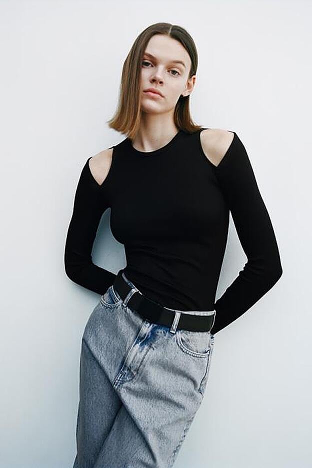 Otra versión en la misma línea y también de Zara, es este modelo en negro con cuello redondo y manga laraga. Cuesta 12,95 euros y, aunque la talla L ya se ha agotado, aún lo puedes encontrar en S y M.