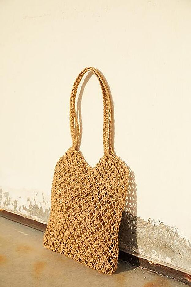 El bolso de hombro viene en color camel, con diseño de red y funda interior a tono. Con asas trenzadas, y cierre de cuerdas en la funda, tiene un precio de 17,99 euros.