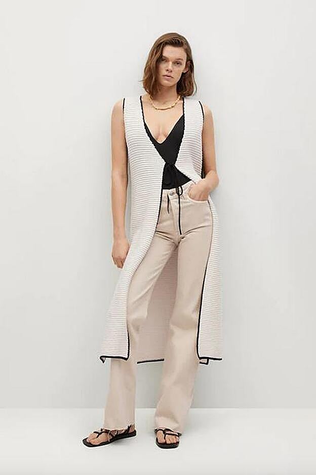El chaleco es de color crudo, diseño largo y recto, y entre sus detalles más bonitos están sus terminaciones a contraste en negro.