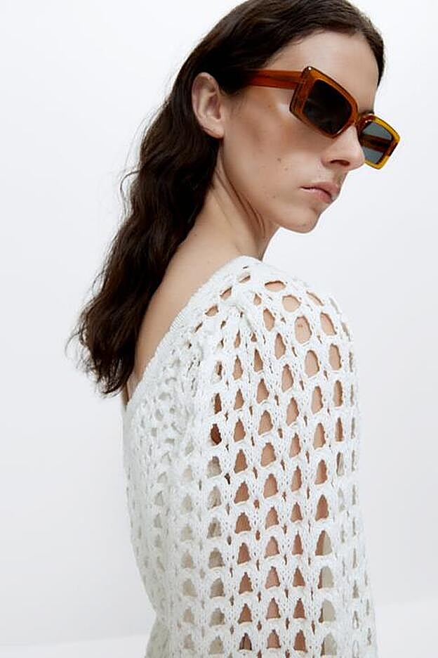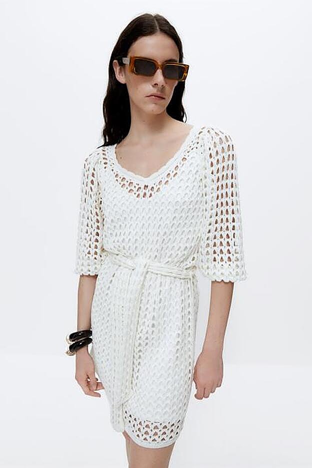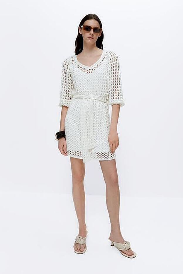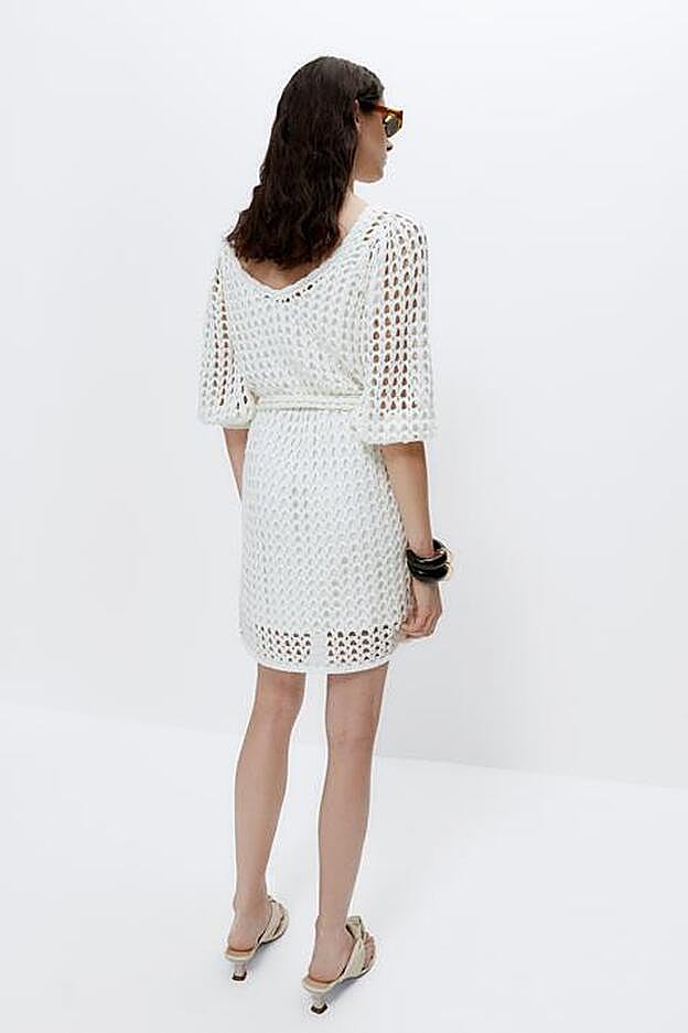 Este bonito vestido de punto calado de Uterqüe viene con forro elástico a tono en blanco y también tiene cuello de pico en la espalda.