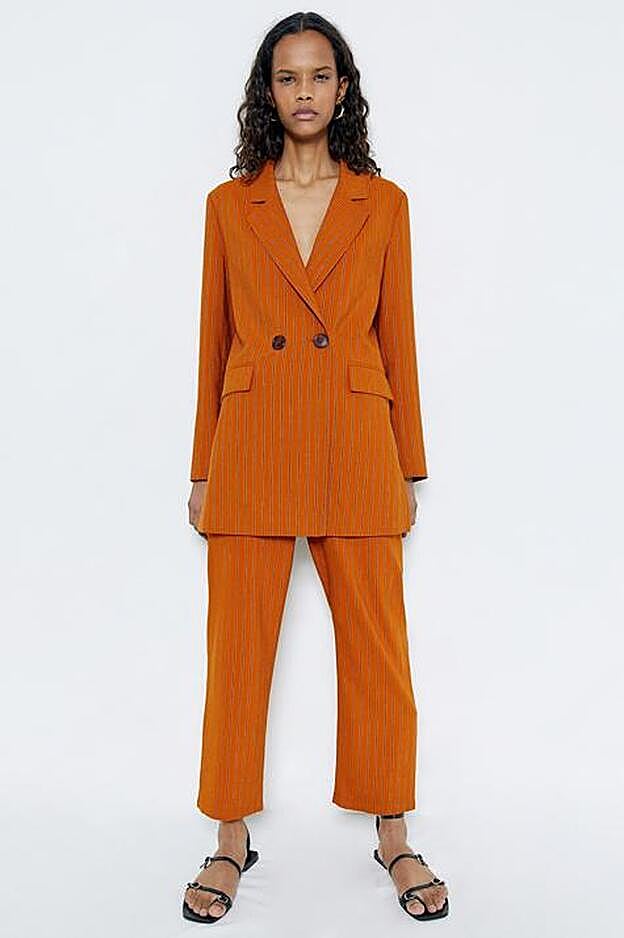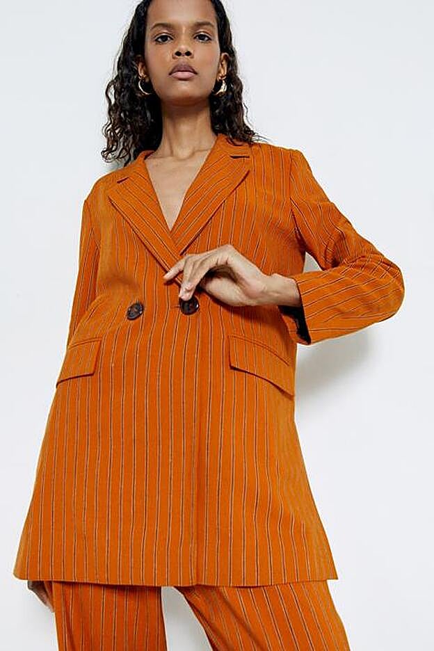 Si nos decantamos por el tono más intenso, el naranja, nos decantaremos por el siempre favorecedor con diseño de rayas, que viene con una americana de cuello solapa con muescas, bolsillos laterales con solapas, aberturas laterales y cierre frontal de dos botones a contraste.