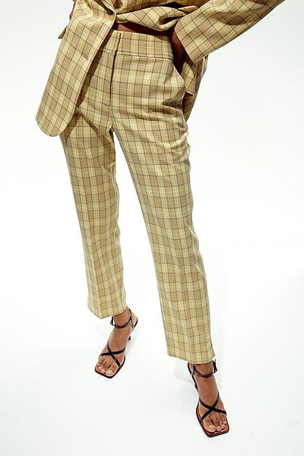 El traje en amarillo pastel apuesta por el estampado de cuadros en beige y gris. Viene con cierre frontal de dos botones a tono, cuello de solapa con muesca y bolsillos laterales con solapa y tiene un precio de 59,99 euros. En la web todavía no está disponible, pero cuando lo haga será en las tallas S y M.