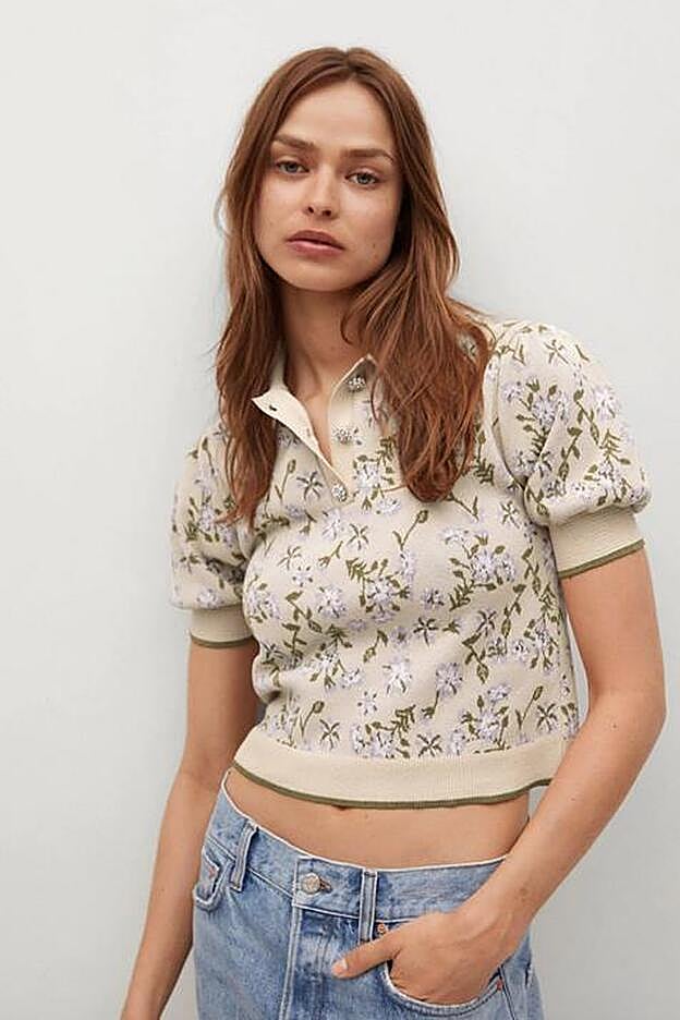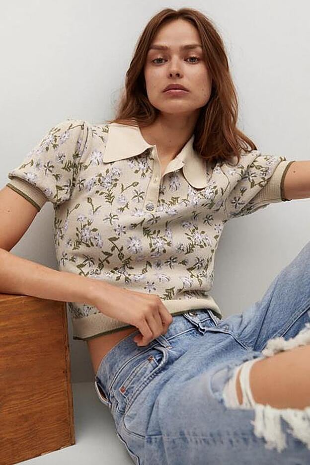 Por ejemplo, este polo con diseño crop está tejido con algodón y viene en color beige con estampado de flores en lila y verde.
