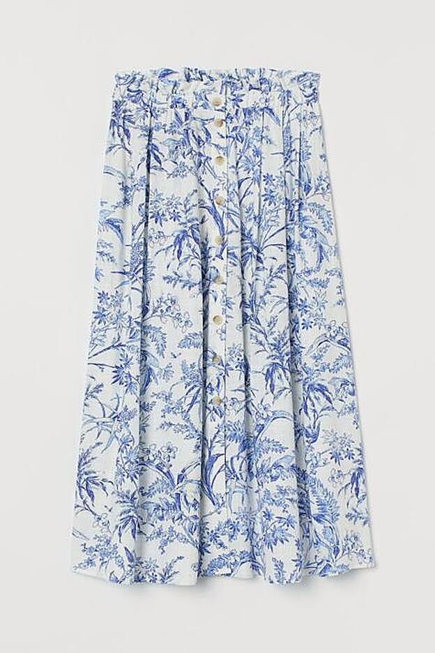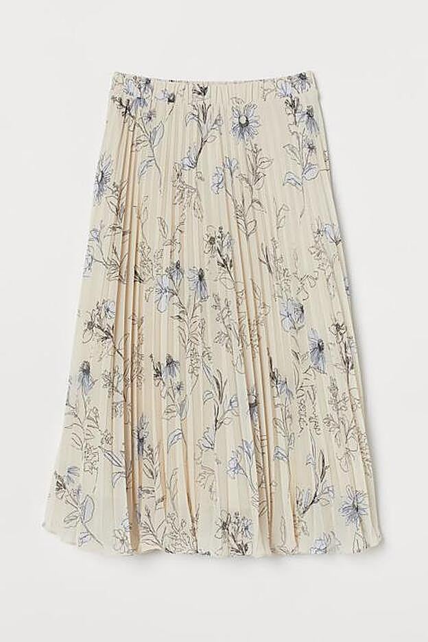 Por último, esta bonita falda en color crema con estampado en tonos azules y negros es de diseño midi vaporoso y está confeccionada en gasa plisada. De talle alto, tiene un precio de 34,99 euros y podemos encontrarla entre las tallas XS y XXL.