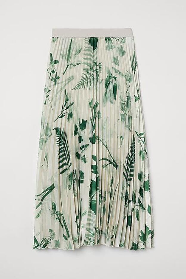Con estampado de hojas en color verde, esta falda en color crema plisada está confeccionada en tejido con ligero brillo, es de talle alto y viene con cintura elástica y bajo sobrehilado. Solo podemos comprarla en la web de la firma por 34,99 euros entre las tallas XS y XL.