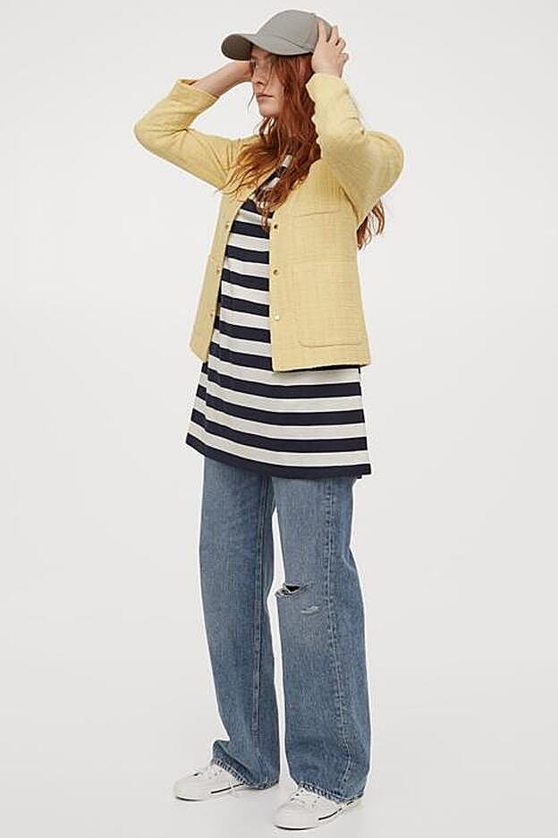 En H&M lo han lanzado en una de las versiones más casual y polivalentes del momento, con un vestido camiseta perfecto para llevar solo o con unos pantalones. Con rayas horizontales en azul marino anchas y fondo blanco, queda por encima de la rodilla.