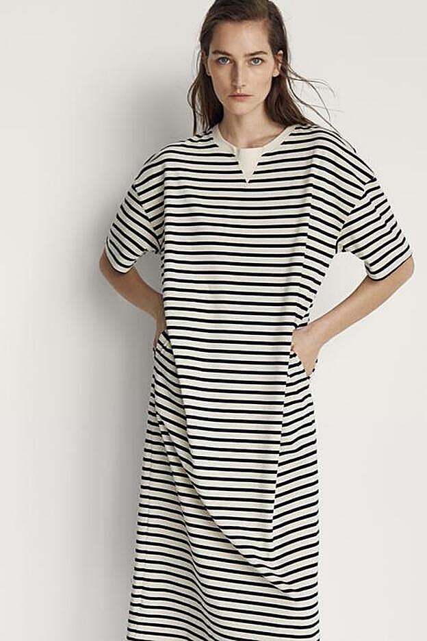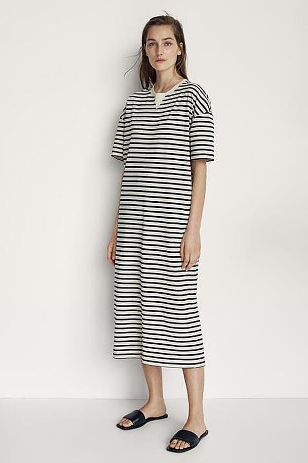 La propuesta más vistosa y cómoda es este vestido largo de rayas azul marino sobre fondo en color crudo de Massimo Dutti que está confeccionado con al menos un 50% de algodón orgánico.